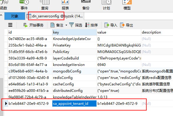 在知识库表“dn serverconfig”中添加一条数据,设置Id、key和value,其中: