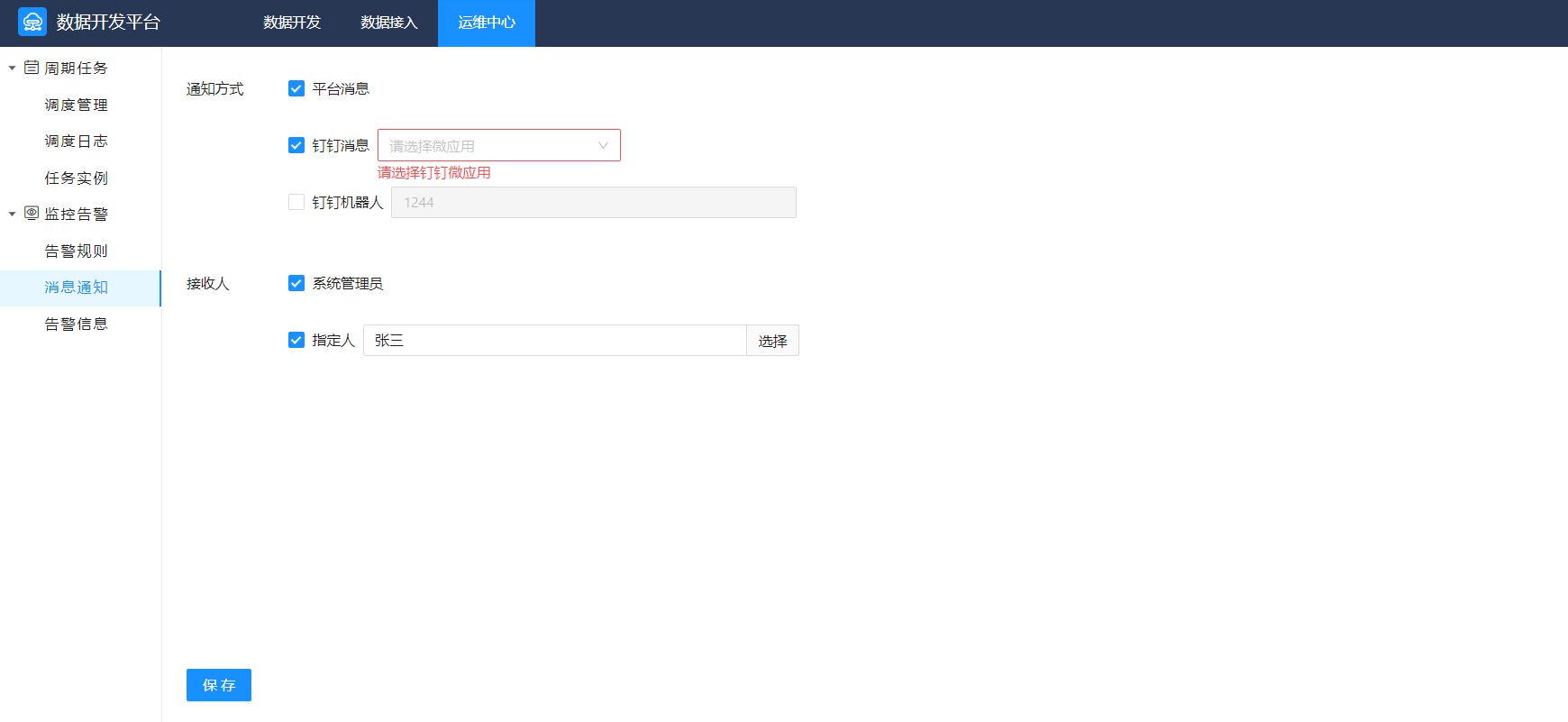 支持通过多种方式通知管理员:平台消息、钉钉消息、钉钉机器人。