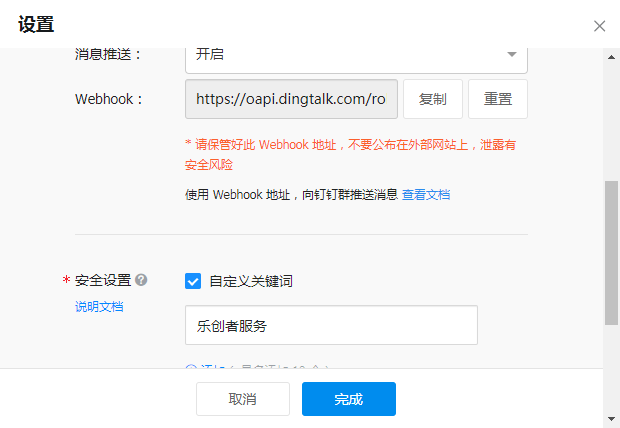 录入机器人名字,然后在安全配置中,勾选“自定义关键词”,并录入关键词信息(录入的内容必须在给钉钉机器人发送信息内容中包含),如:乐创者服务。