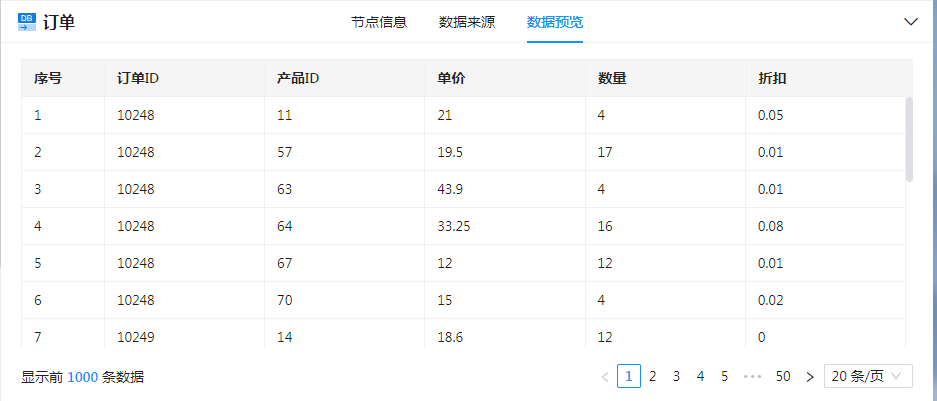 2)添加【DB输入】节点命名为“订单”,选择“订单明细”表,配置如下图: