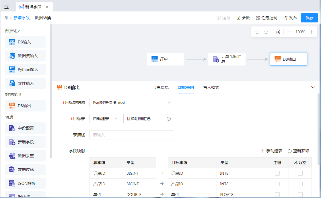 添加【DB输出】节点与【新增字段】节点连接,配置“数据去向”将处理后的数据输出。如下图所示: