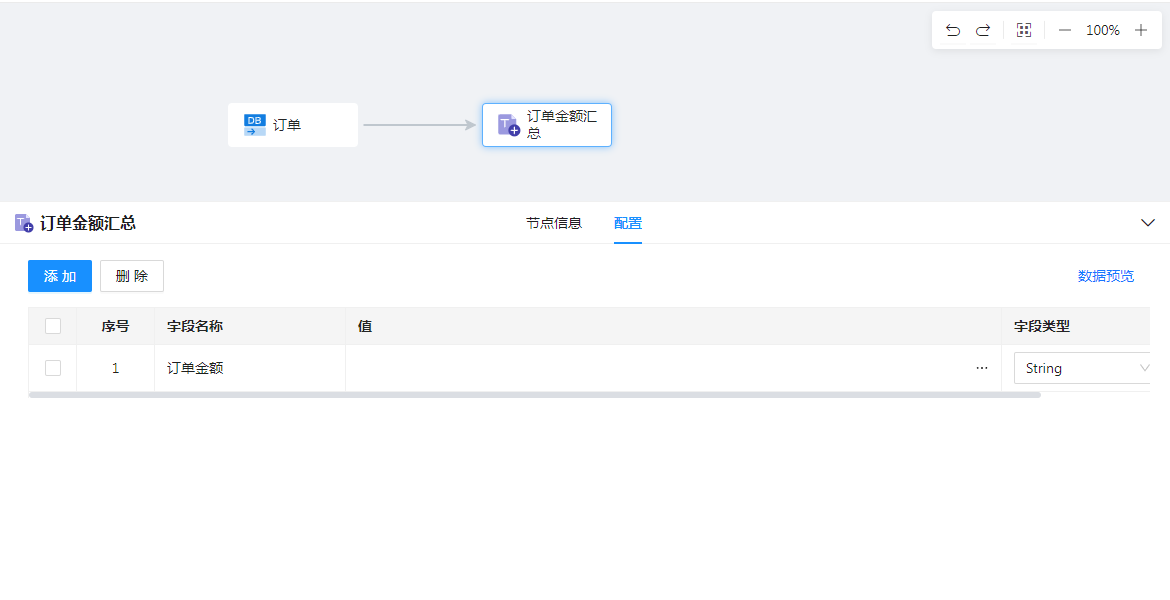 添加【新增字段】节点命名为“订单金额汇总”,新增字段“订单金额”,如下图: