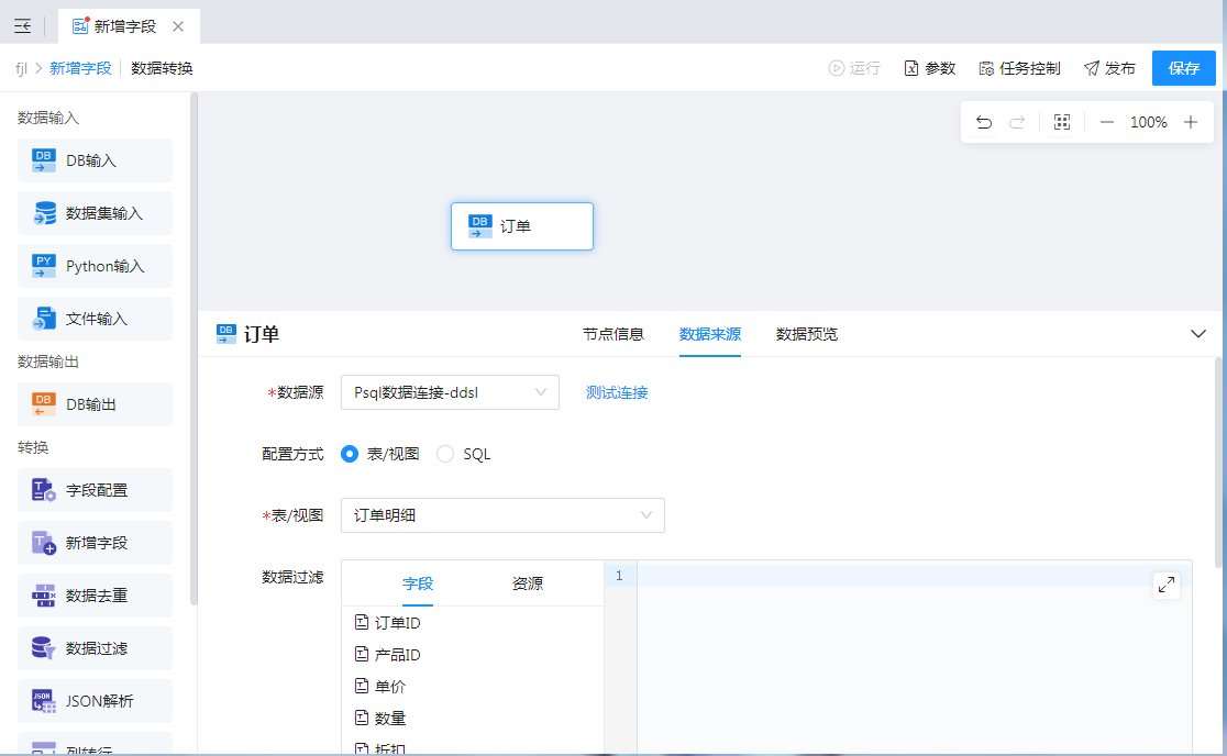 如果需要根据常量、参数和其他字段进行公式计算或逻辑映射,将结果放到新的一列,参与后续运算或进行输出,那么可以使用【新增字段】组件实现。