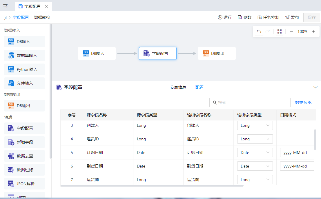 如果只是对数据进行格式转换、空值使用特定值进行填充等操作,可以使用【字段配置】组件实现。