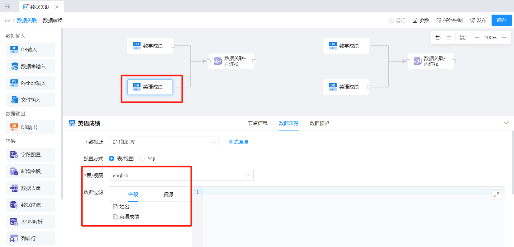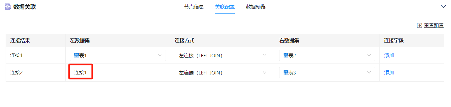 - 若关联两张表数据,左表、右表均为可选项;若关联两张以上表数据,从第二次关联开始,左表不再是可选项,而是默认为上一步的连接结果,右表始终为可选项。
