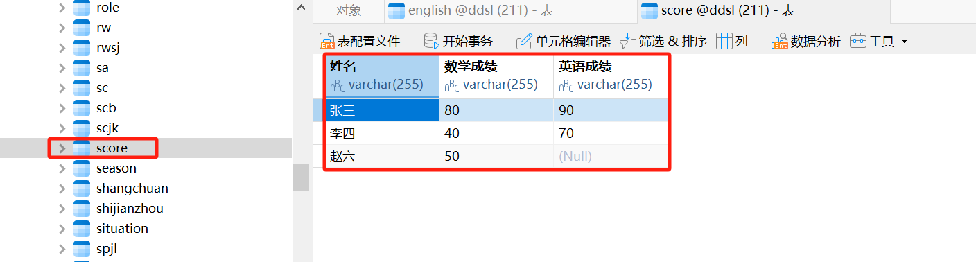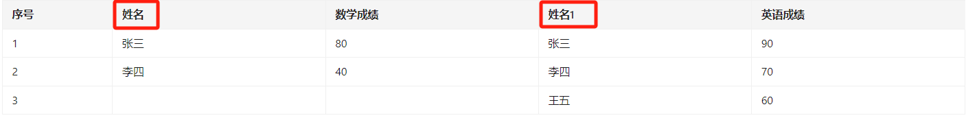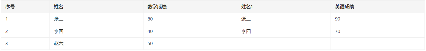 现希望将数学成绩表左关联英语成绩表进行展示,如下图所示: