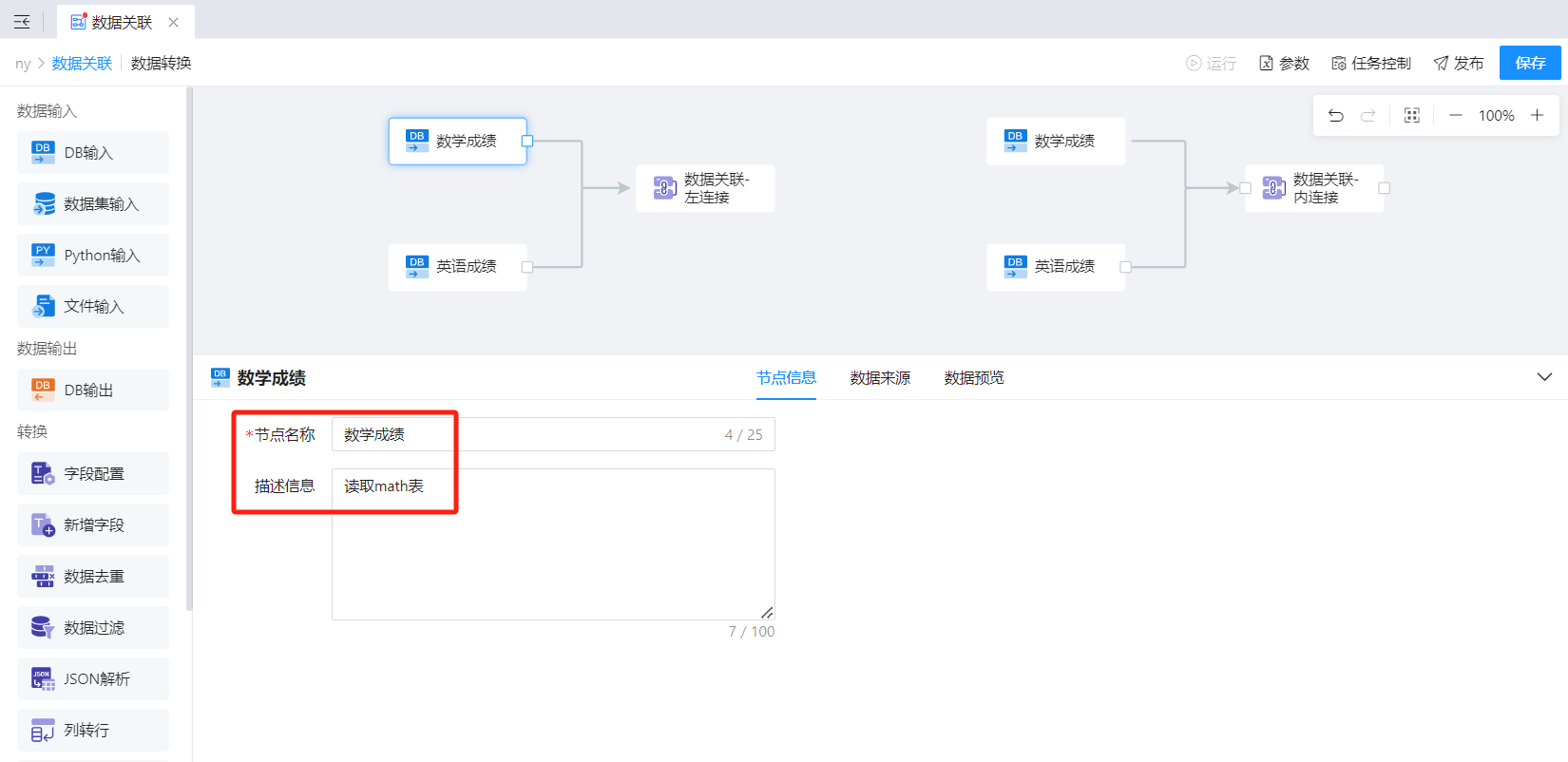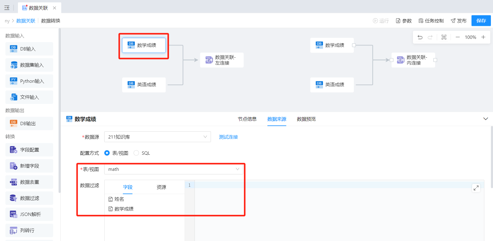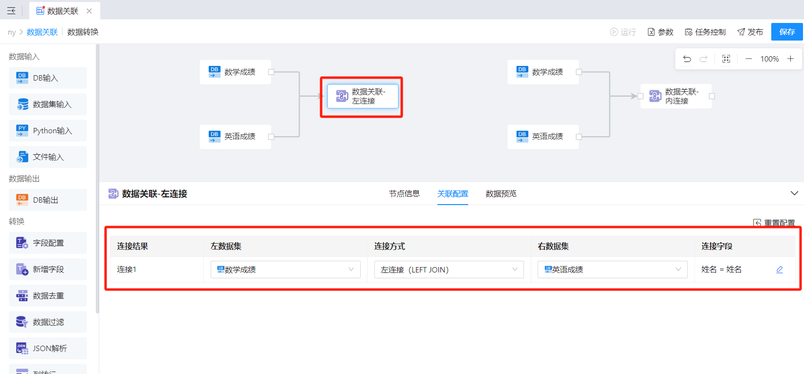 - 若连接方式选择左连接/右连接时,请确认好左表和右表是否正确(A表左关联B表,与B表左关联A表,关联逻辑是不同的)。