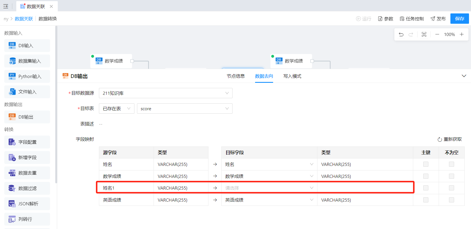 1)拖入「DB表输出」算子,将关联后的数据输出,取消姓名1列的映射。如下图所示: