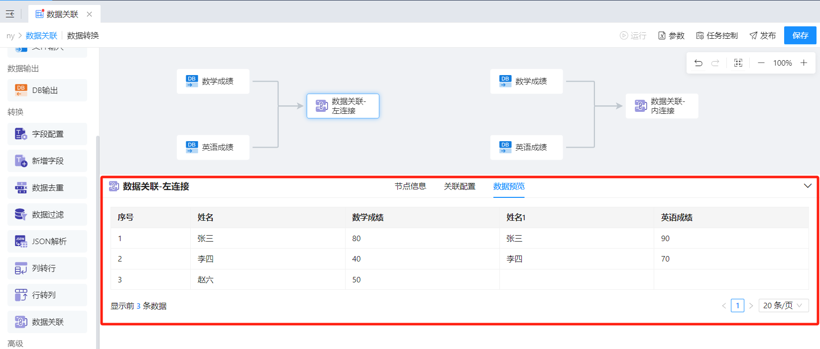 1)拖入「数据关联」组件,连接方式选择左连接,连接字段选择姓名。如下图所示: