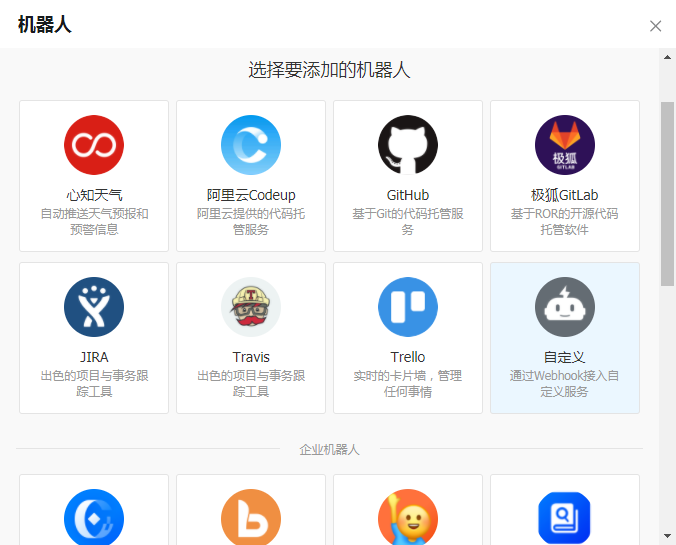 钉钉中创建一个运维群,点击『群设置』,选择『机器人』,在弹出的『机器人管理』中,点击“添加机器人”,在弹出的机器人窗口中,点击“添加机器人”,选择“自定义”类型的机器人: