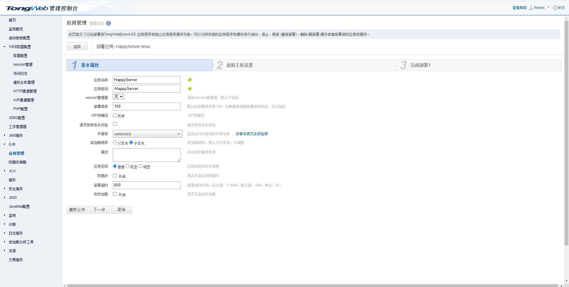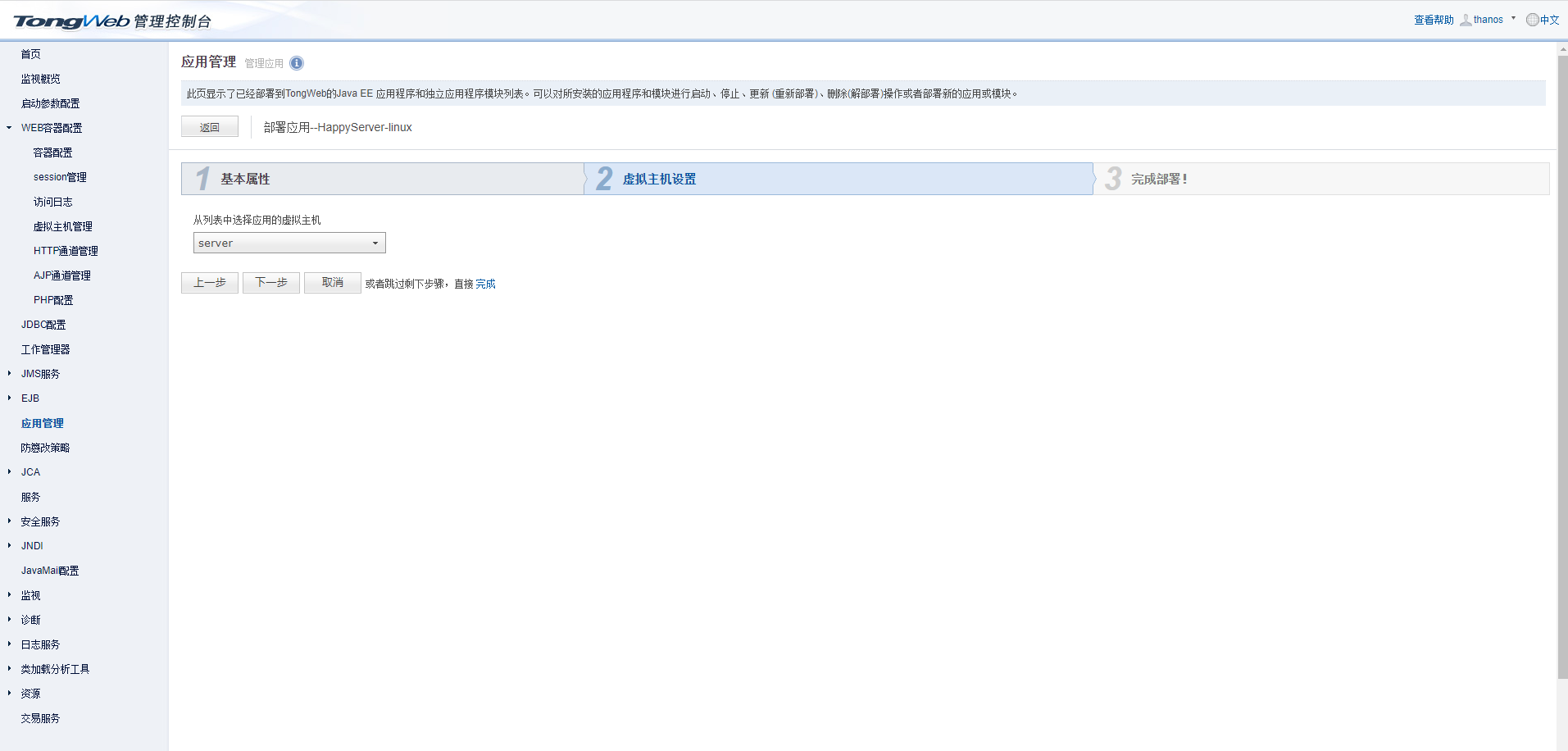 修改应用名称和应用前缀,如:lczServer。 点击“下一步”后选择虚拟主机: