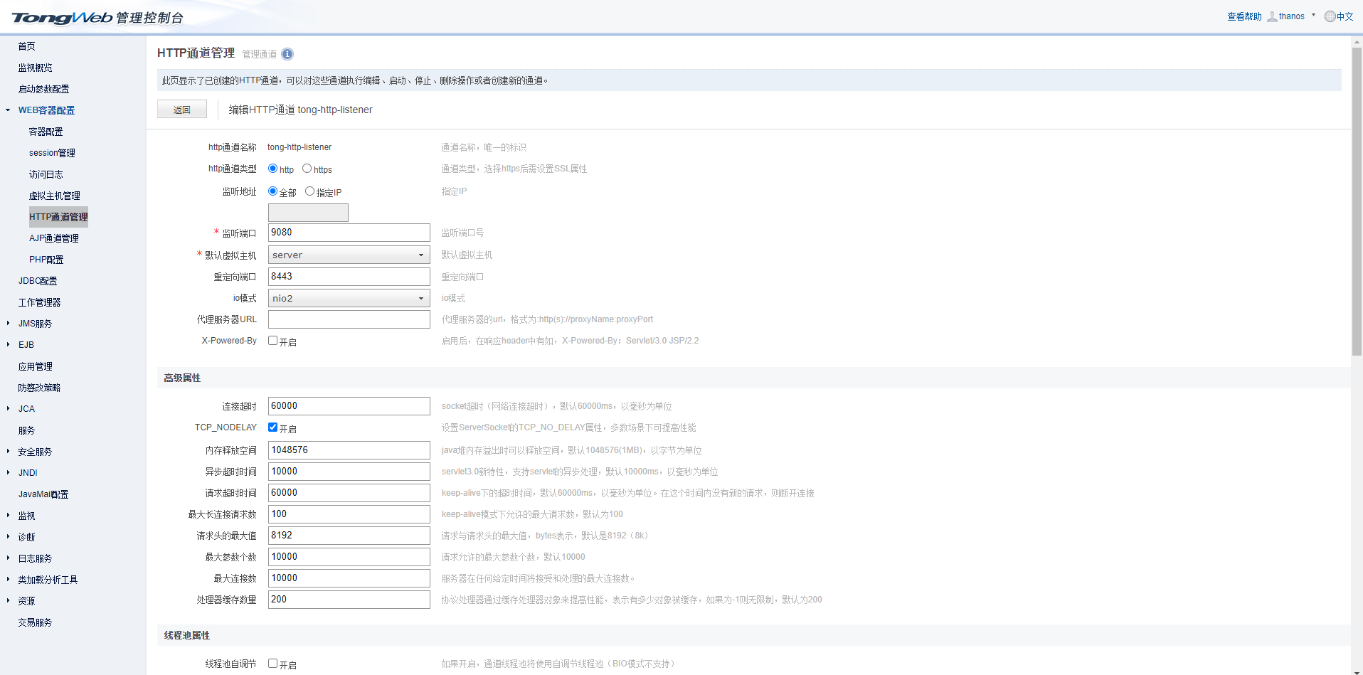 访问端口默认为9080,可以在HTTP通道管理的tong-http-listener中修改: