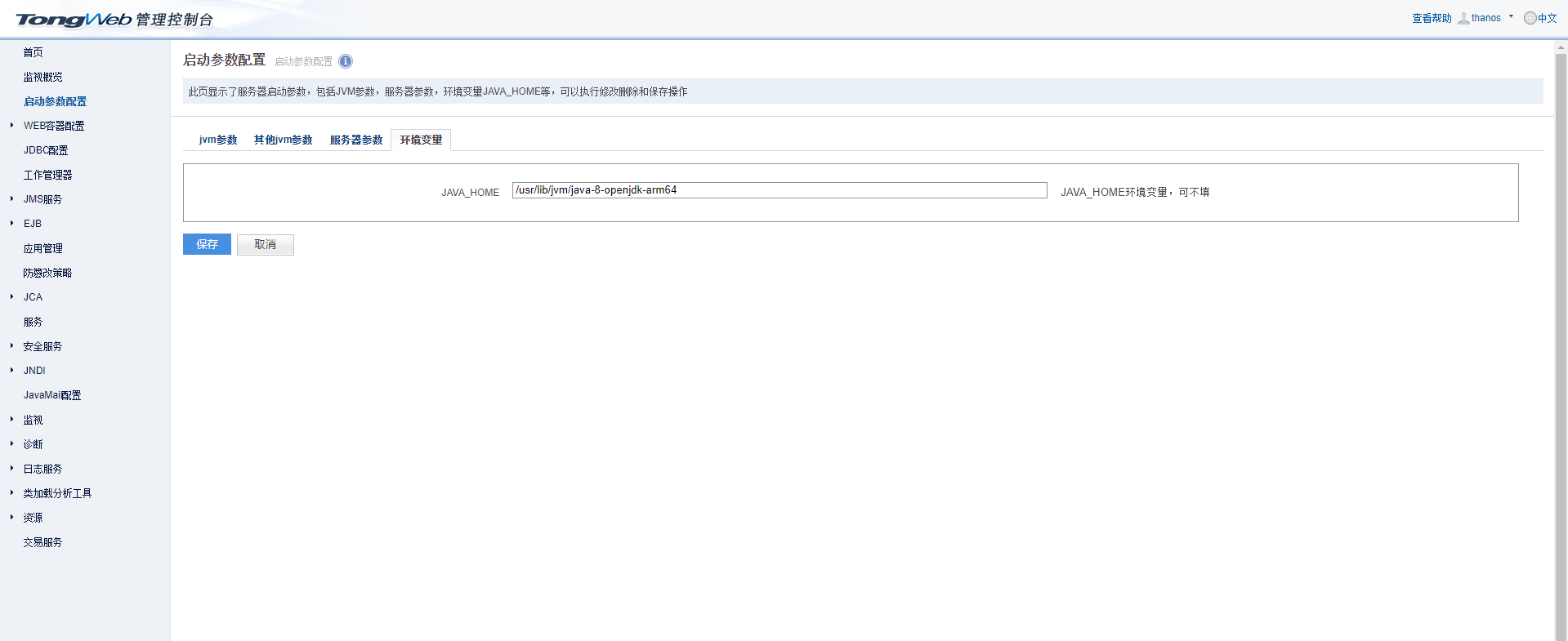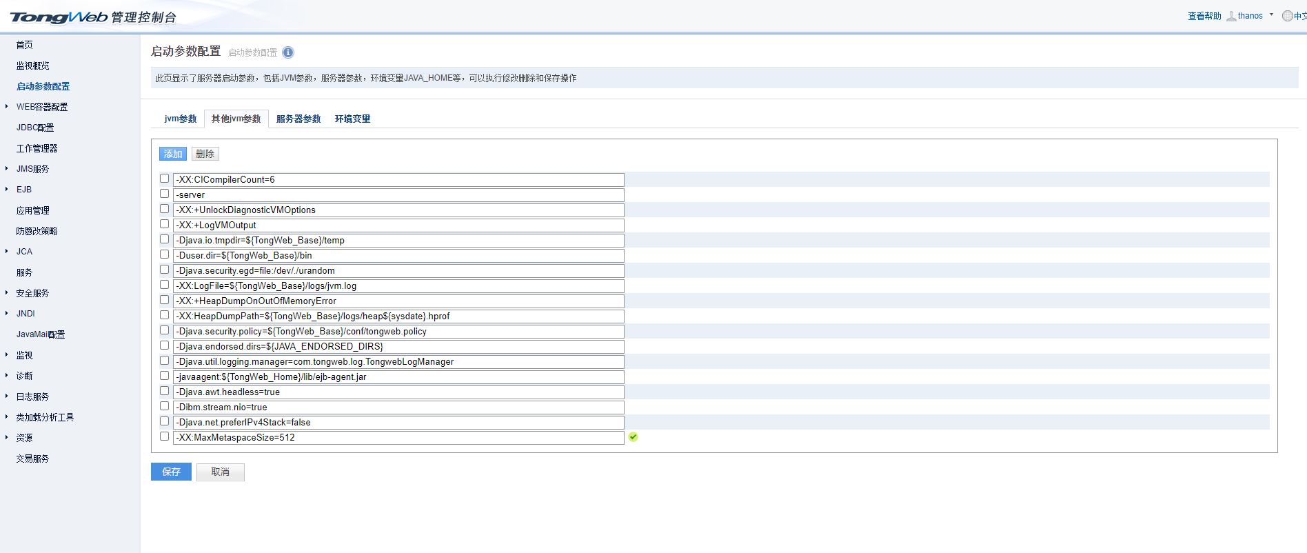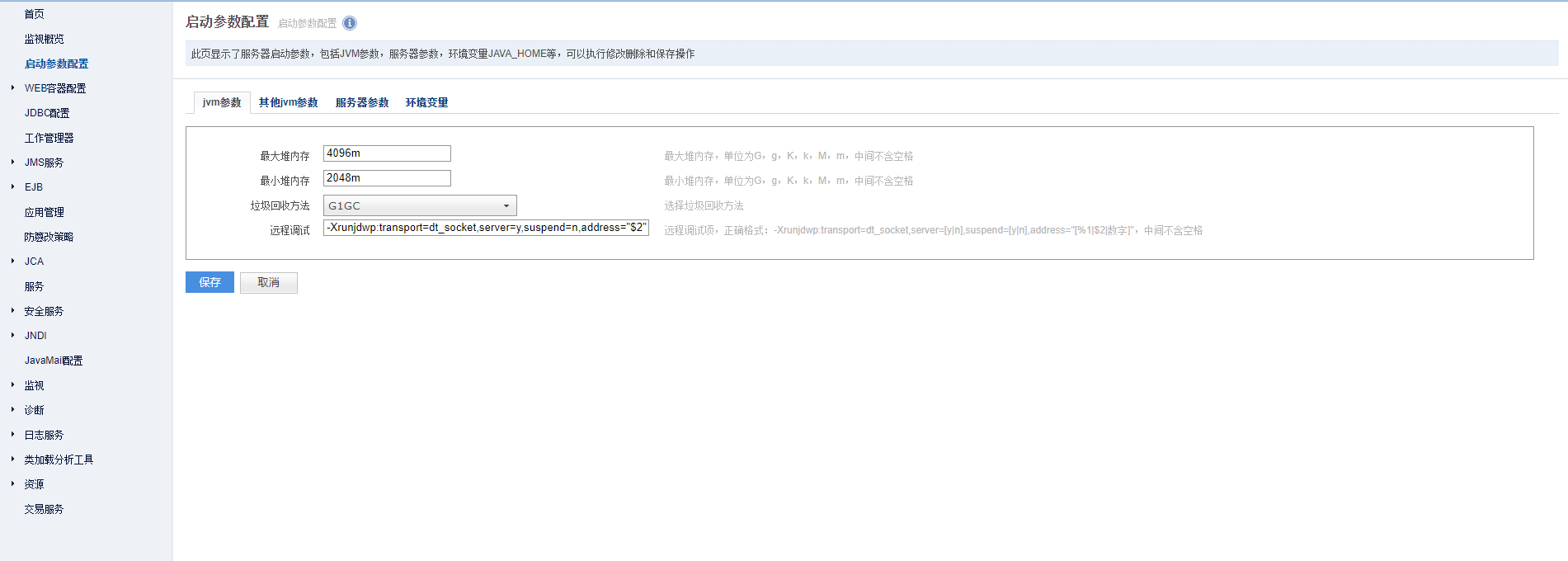 登录管理页面后需要在启动参数配置中配置jvmc参数: