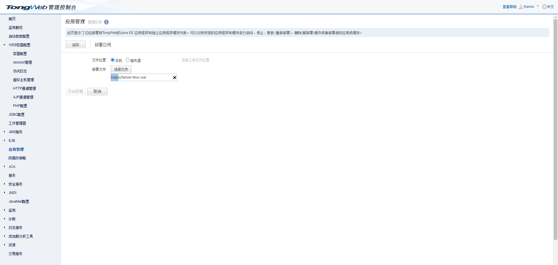 在应用管理中点击“部署应用”,选择下载的发布包: