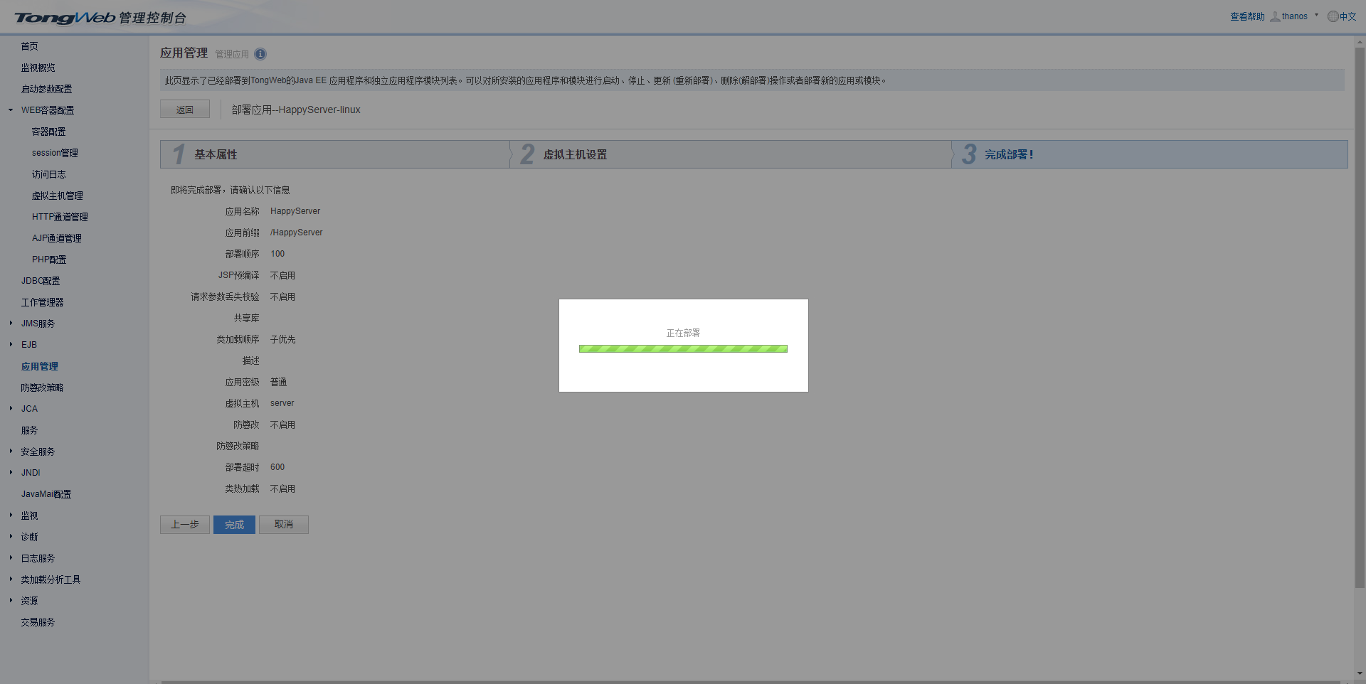 点击“下一步”后点击完成,开始部署应用: