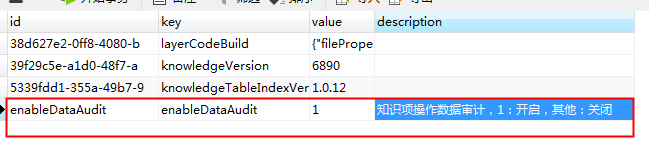 当我们需要监视用户知识项操作时,可以通过启用知识项数据审计的功能,目前暂不支持界面配置,需手工在知识库dn_tenantconfig表中增加以下记录: