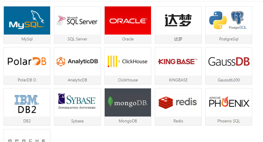 华为Gaussdb100、华为Gaussdb200、人大金仓、达梦、阿里云Polar DB MySql、阿里云Polar DB O、阿里云AnalyticDB、TIDB等,其他国产化数据库也在不断适配中。