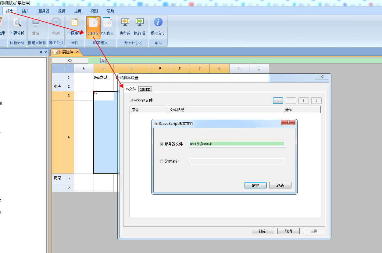 如果扩展组件的业务比较复杂,实现代码比较多,可以将业务实现的代码编写在js文件中,通过上面加入js文件的方式载入,然后在表单中调用文件中的方法即可。