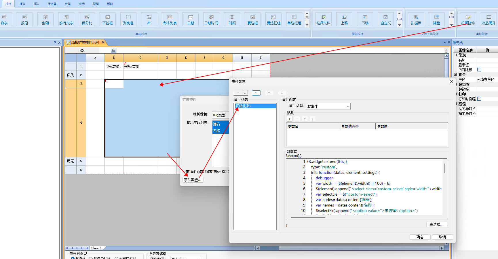 控件初始化入口函数。/** * 扩展控件初始化入口函数(作为用户构建控件实例的入口) * @param datas 扩展控件数据集(来源于扩展单元格上设置的模板数据和选择的字段),格式:{'列名1':[列数据],'列名2':[列数据]} * @param element 扩展控件所属的element对象 * @param settings 报表对象 */ init: function(datas, element, settings) { }