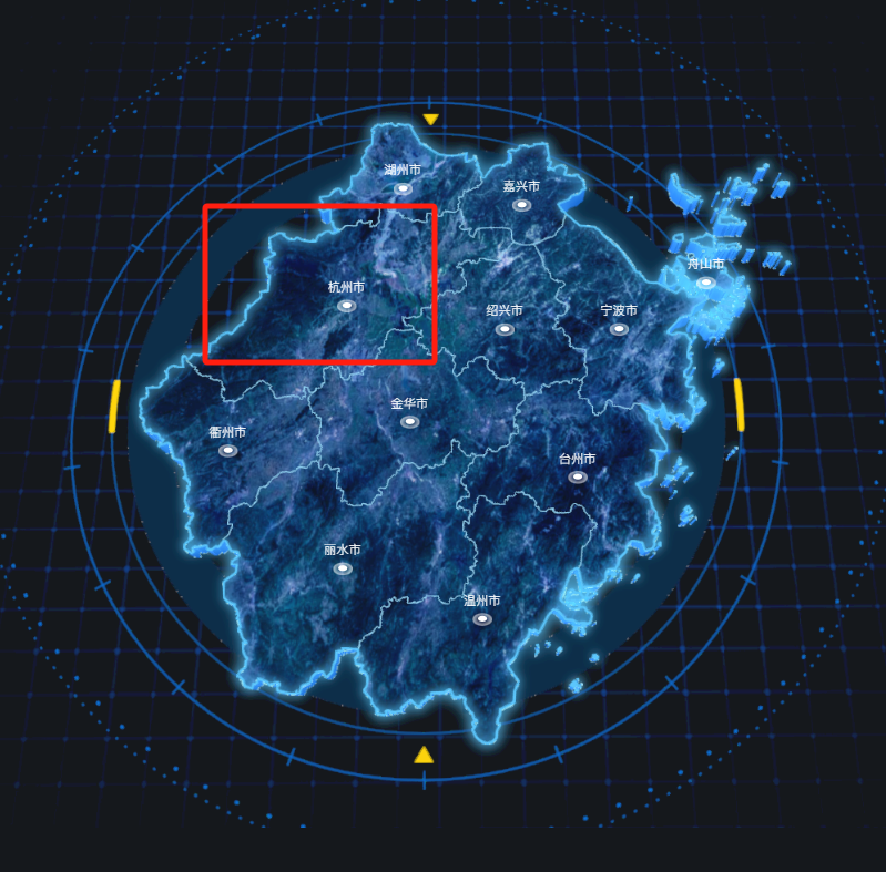 地图块 | 某一层级的地图中,构成地图的每一个行政区划边界的所围成的区域就是地图块。如下图所示红色方框圈出的不规则边界内是杭州市的地图块: |