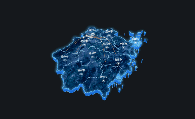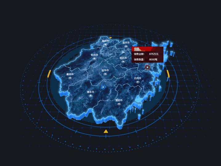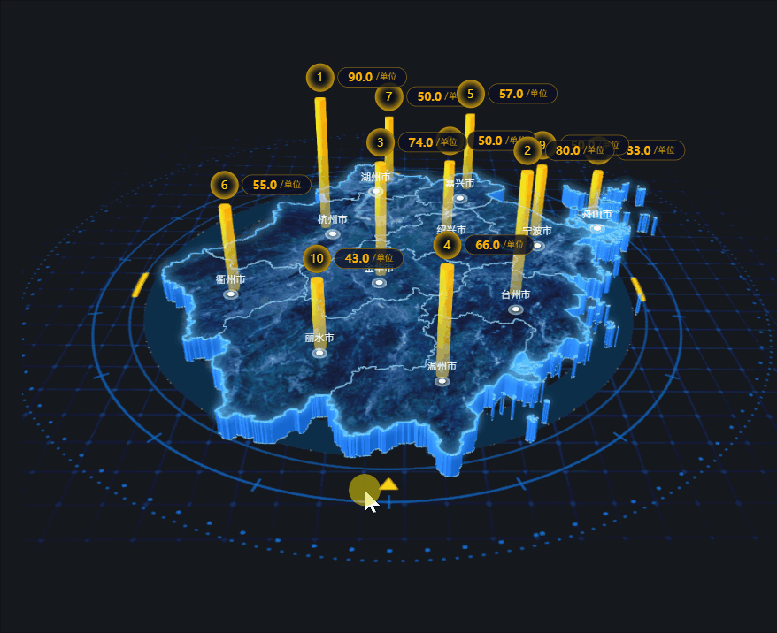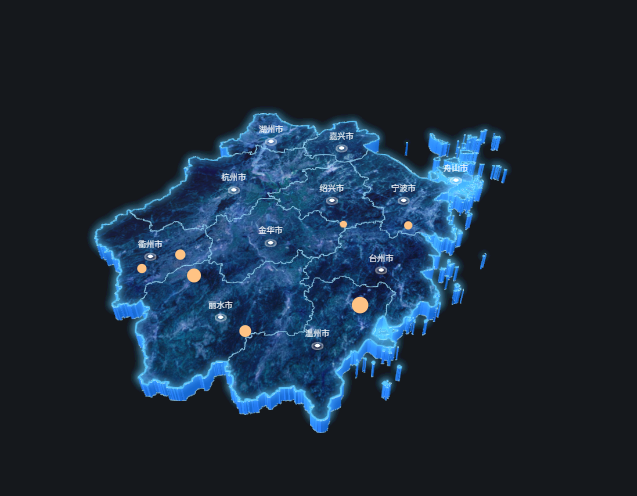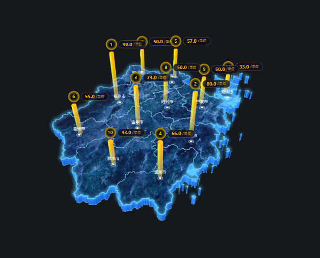 该组件主要以三维形态对相对宏观地图数据进行展示,支持添加图片、区域热力、标牌柱子、散点、飞线等地图子图层。