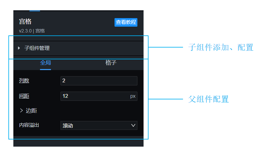 宫格组件主要由「父组件」及「子组件」两部分组成,可根据实际场景分别定义对应配置项。