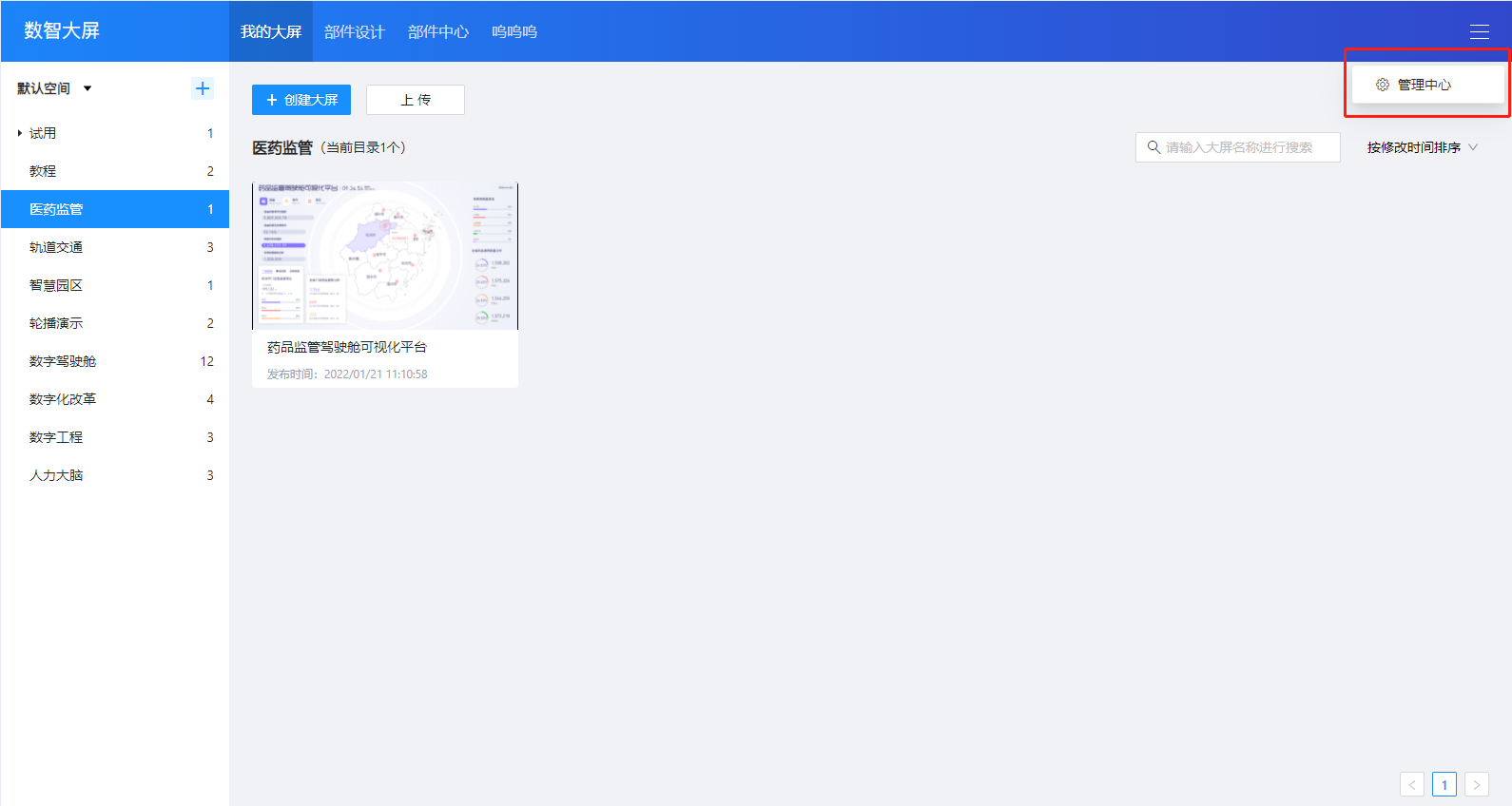 有权限的用户登录门户后,在对应应用中即可访问【数智大屏】菜单,进行大屏设计和管理。