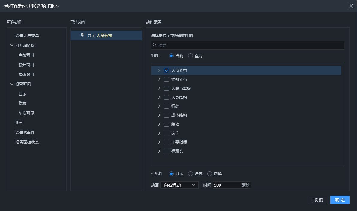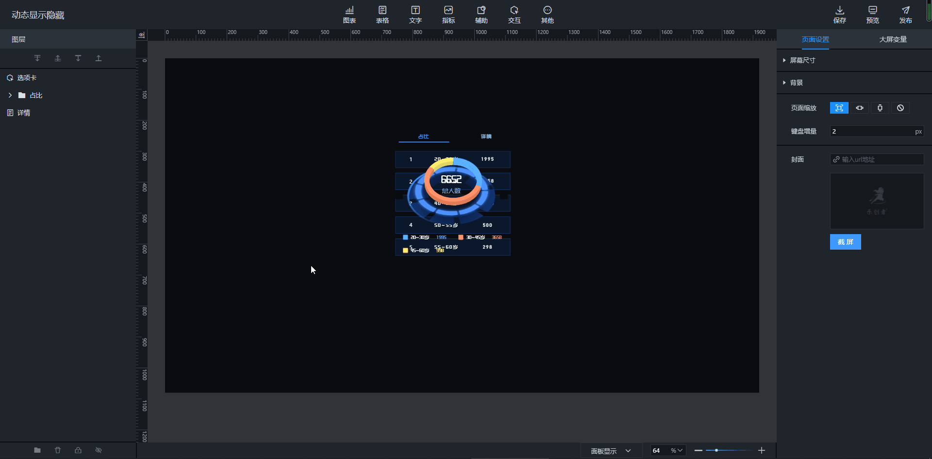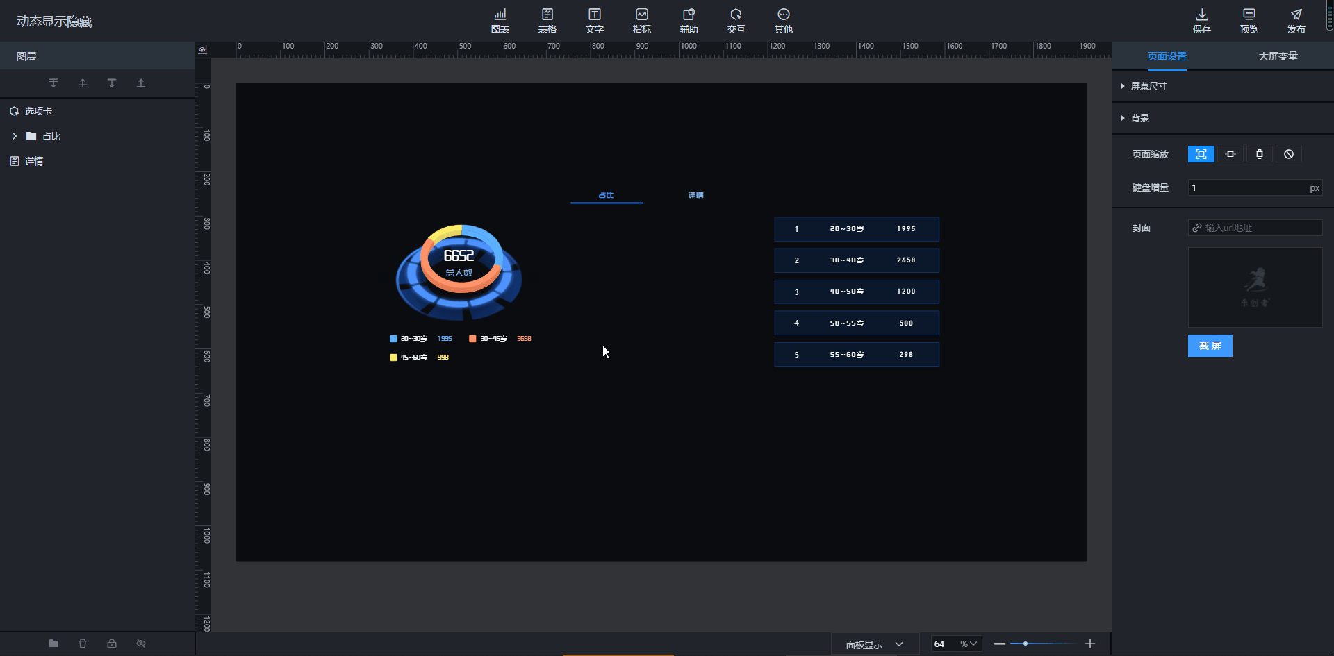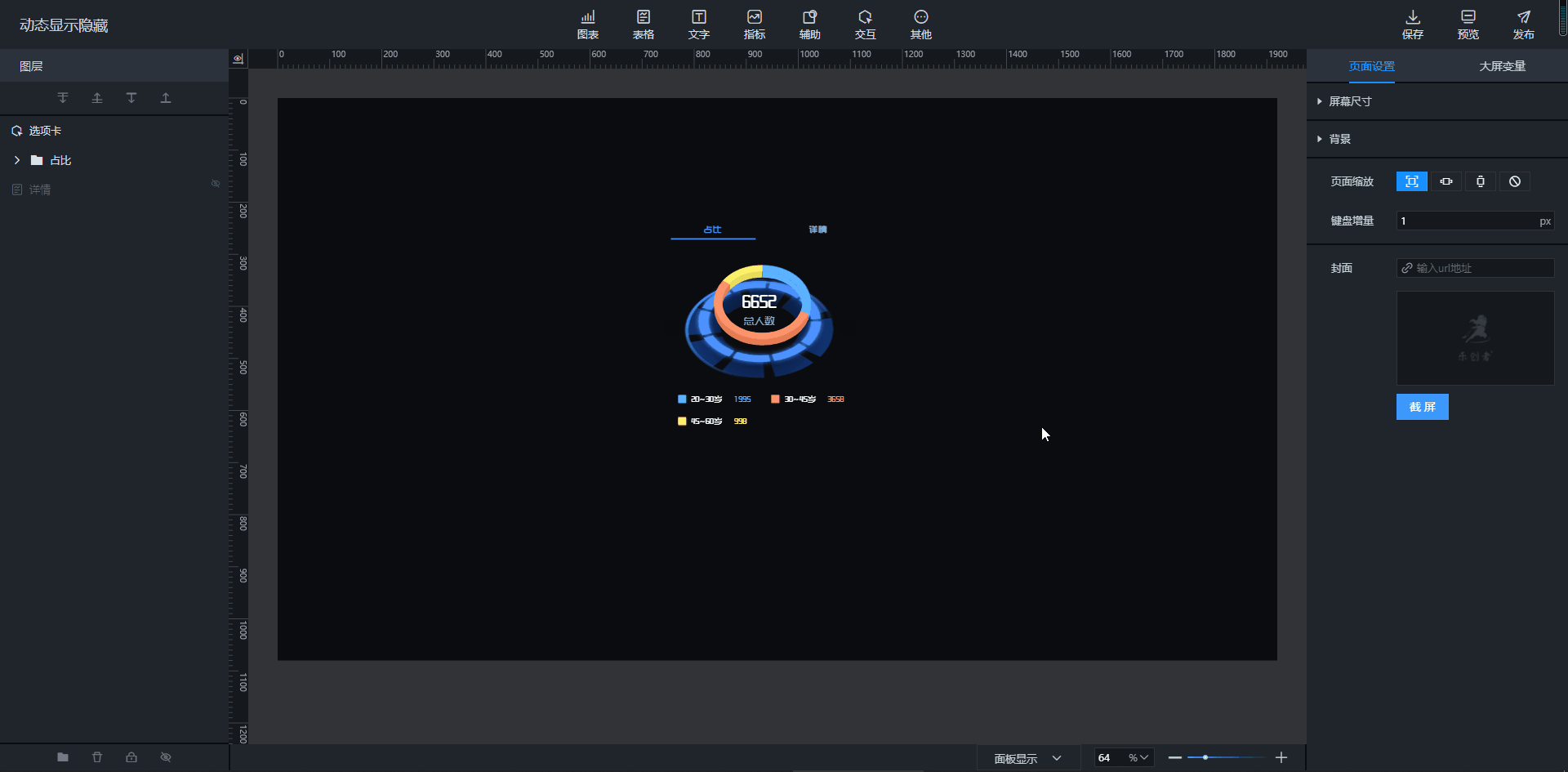 交互配置支持实现大屏内的组件对象动态显示隐藏,以应对复杂的可视化交互需求。