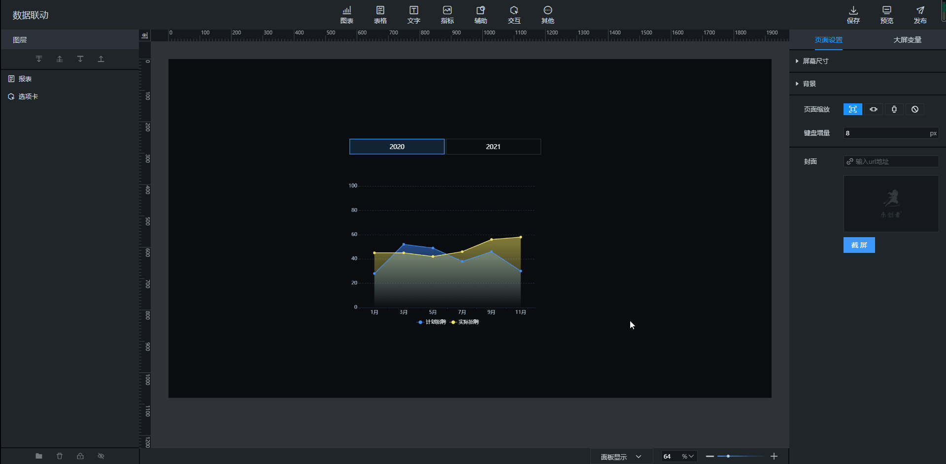 • 最终实现,切换【选项卡】时,将把选中的内容值(2020或2021)传递给大屏变量【年】,进而传递给图表参数【年份】,最后实现了切换选项卡时联动图表数据的交互效果。