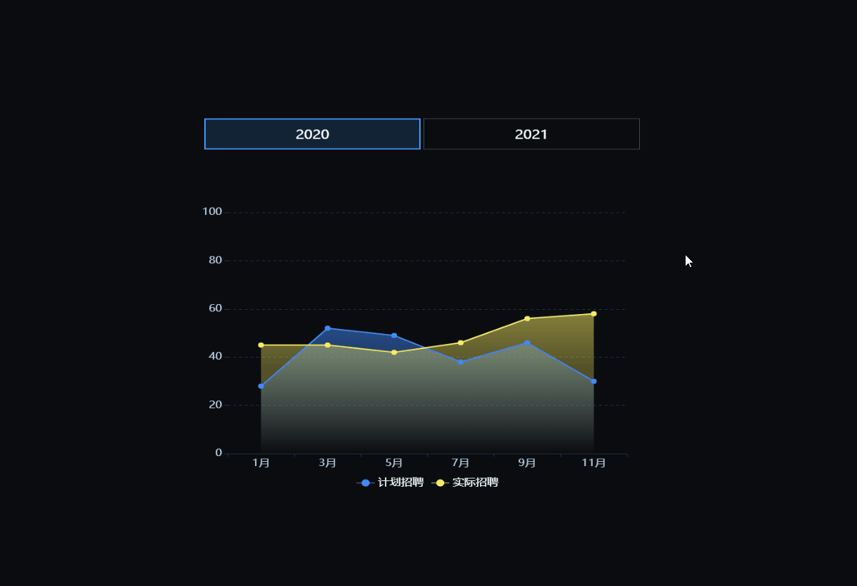 如图,通过选项卡切换查看2020和2021分别对应的招聘情况(面积图)数据。