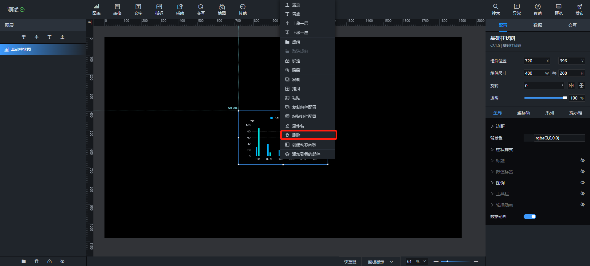 添加组件删除组件添加组件在组件栏中选择所需组件,点击该组件,即可添加到大屏,通过拖拽即可调整组件位置。或在组件栏中选中所需组件,拖拽至画布中,也可完成组件的添加。删除组件如需删除组件,可在图层处或选中组件后右键,即可弹出工具栏,在其中点击删除,即可删除该组件。删除组件也可使用快捷键操作,即在选中组件后,按下”delete”按键,可实现组件的删除。需要注意的是:组件删除后不可恢复。作者:倪 创建时间:2023-06-05 11:39最后编辑:倪 更新时间:2025-02-07 17:25