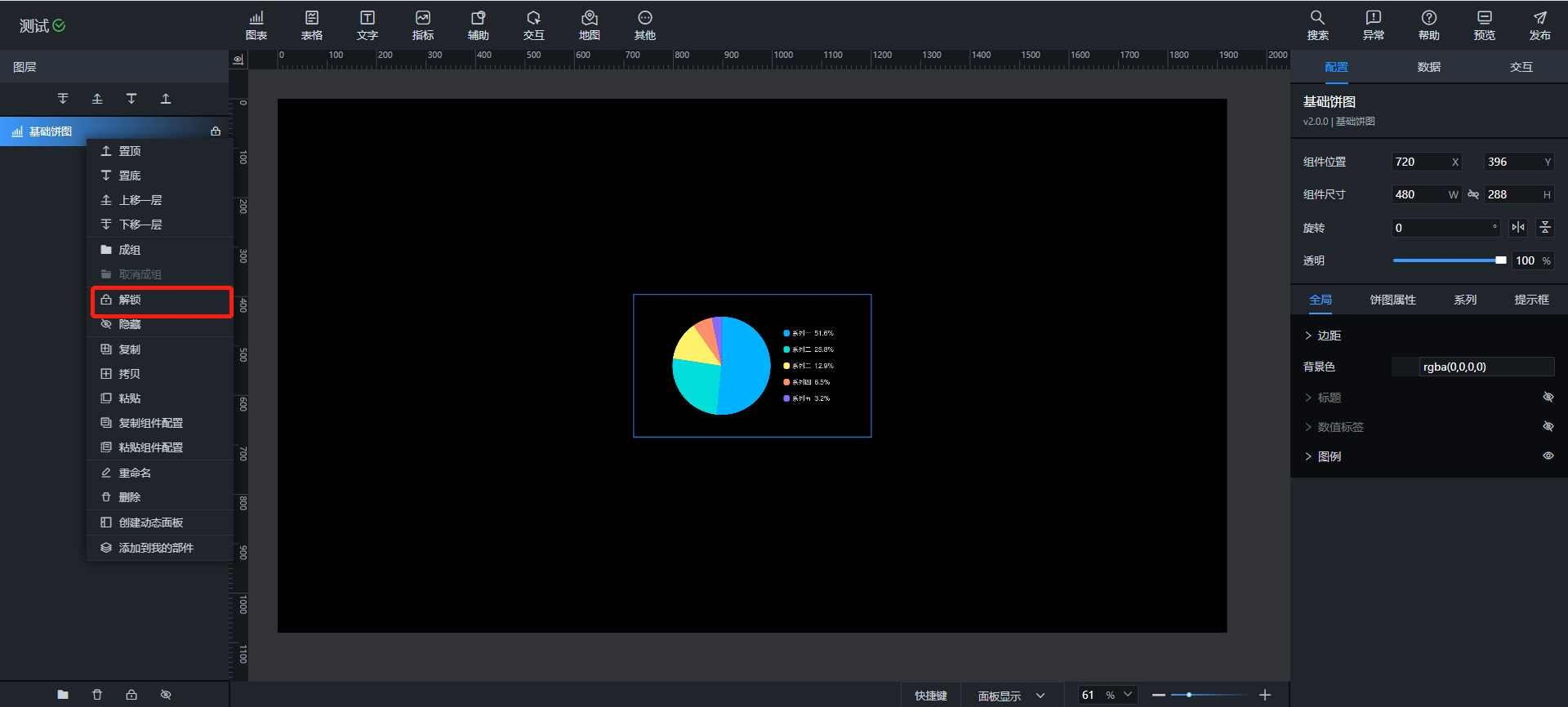 画布中被锁定的组件无法被选中,如需解锁组件,则需在左侧图层栏中选中该组件图层,右键弹出工具栏,点击“解锁”即可解除组件锁定。