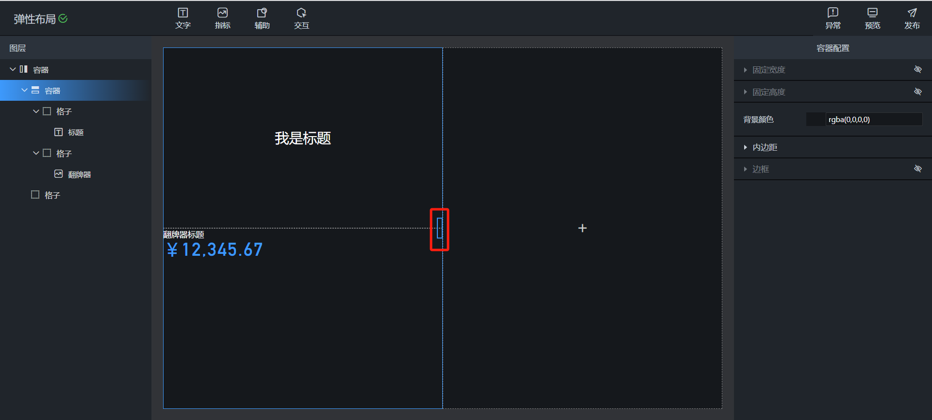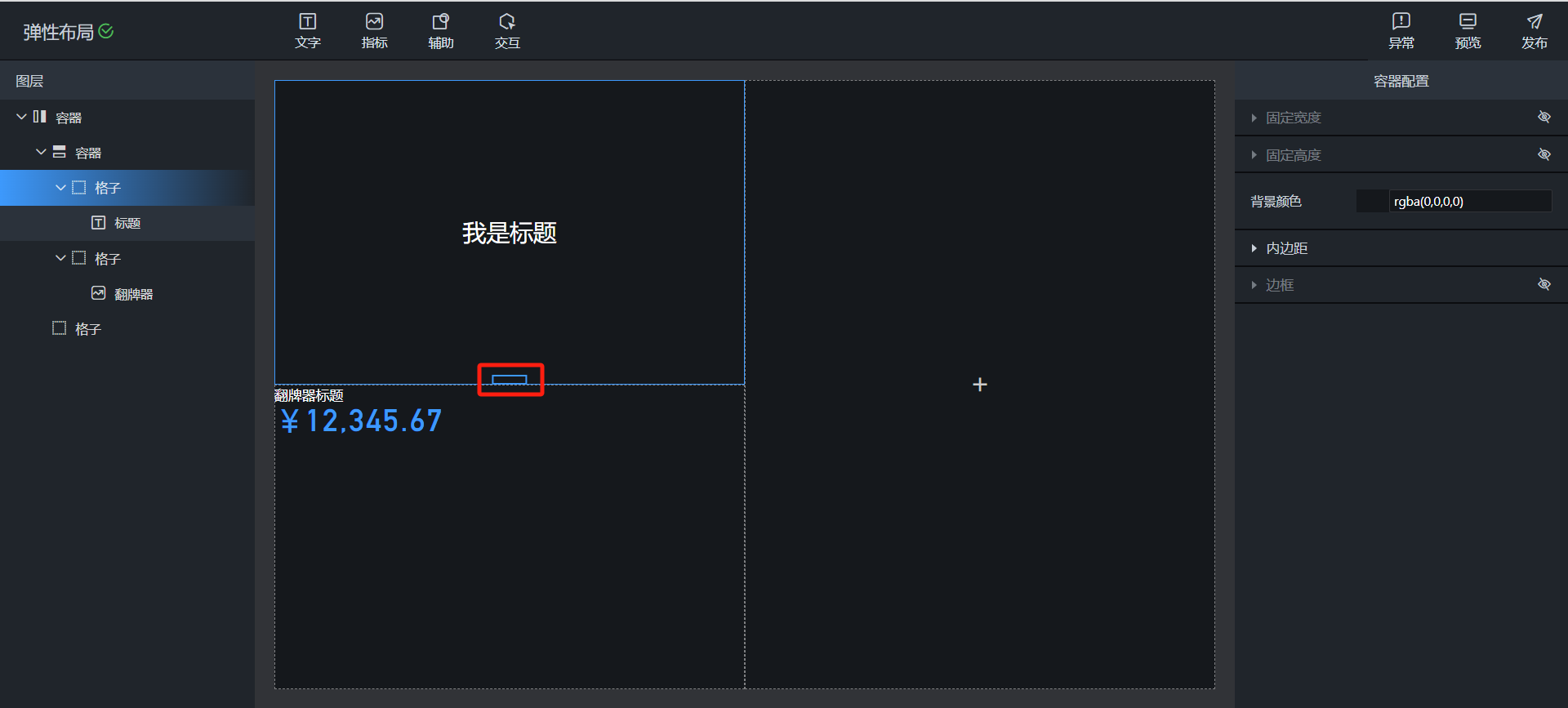 数智大屏弹性布局提供了容器布局时的移动、调整高度等功能,使操作更流畅。您可以在画布区,使用鼠标对容器进行自由布局。支持的操作如下。