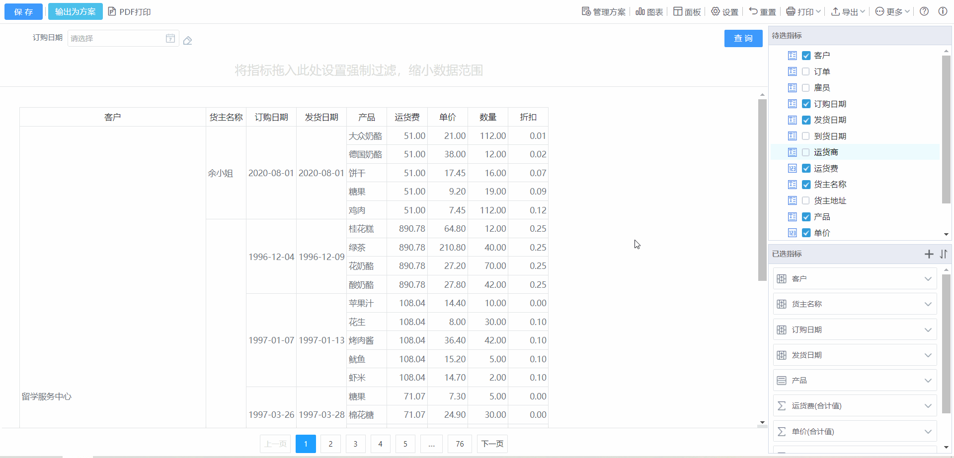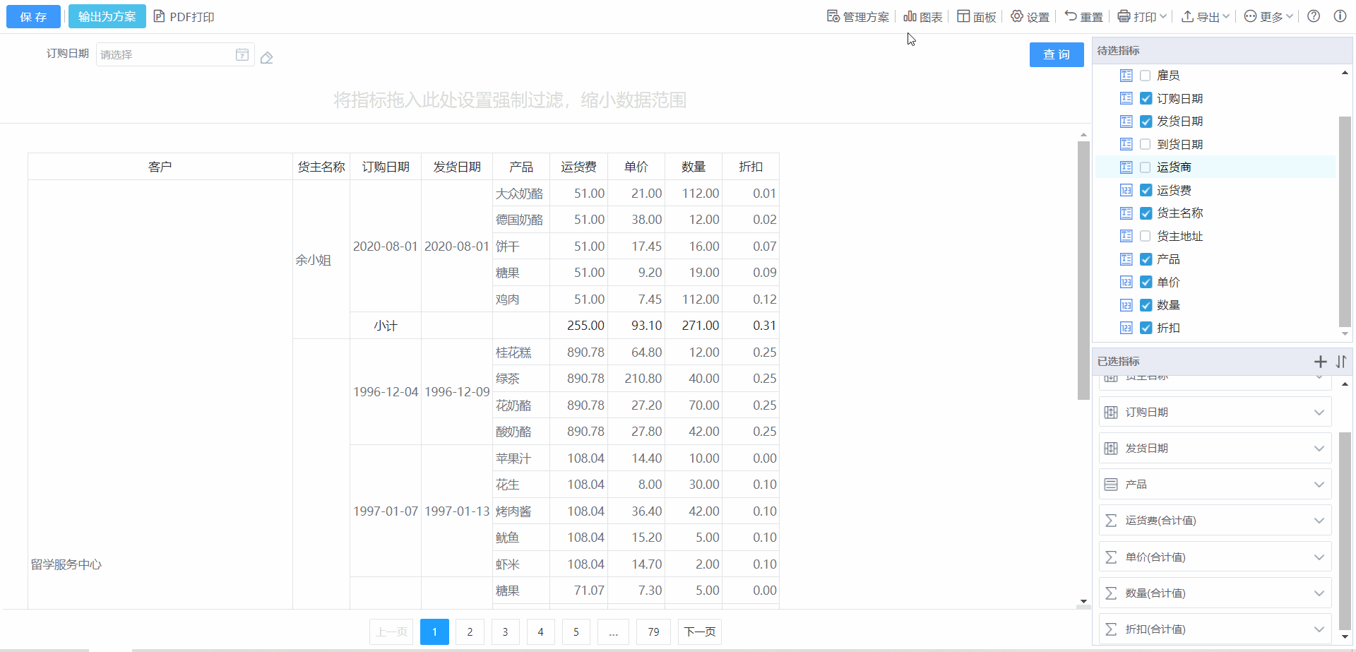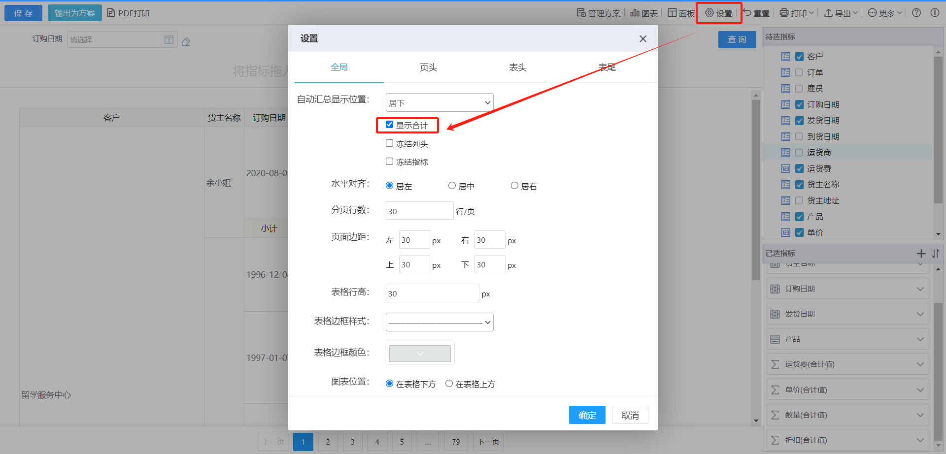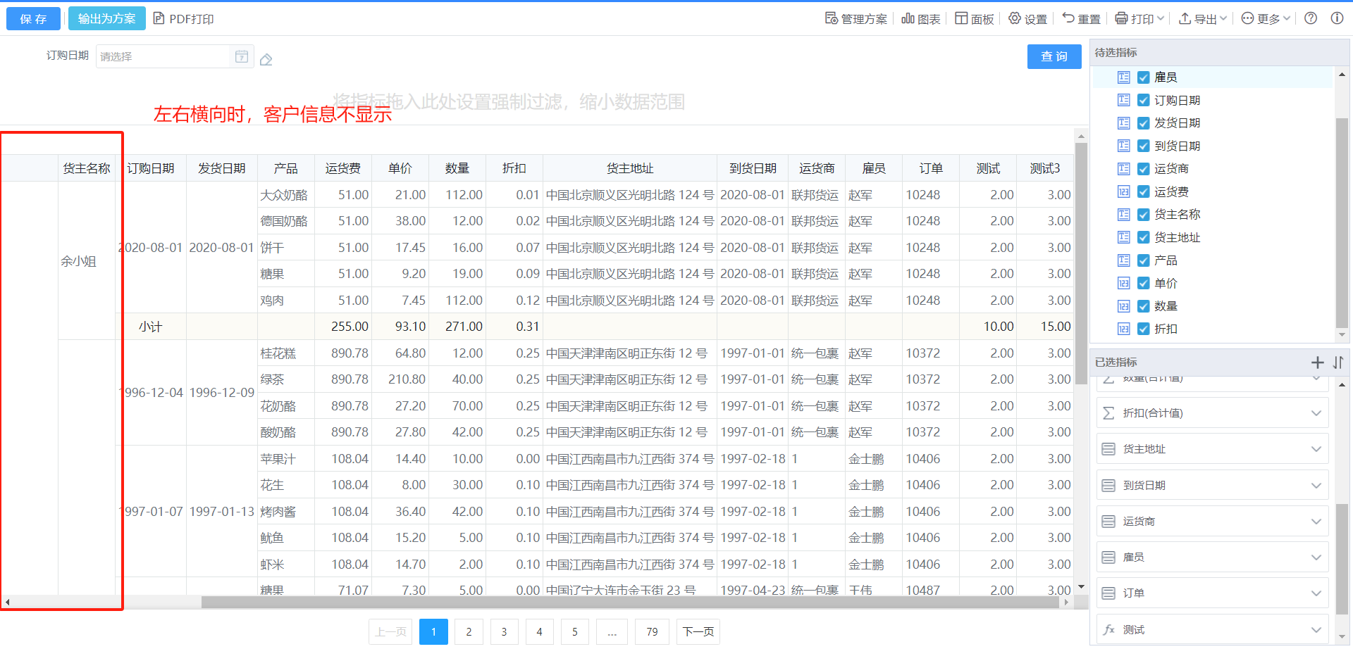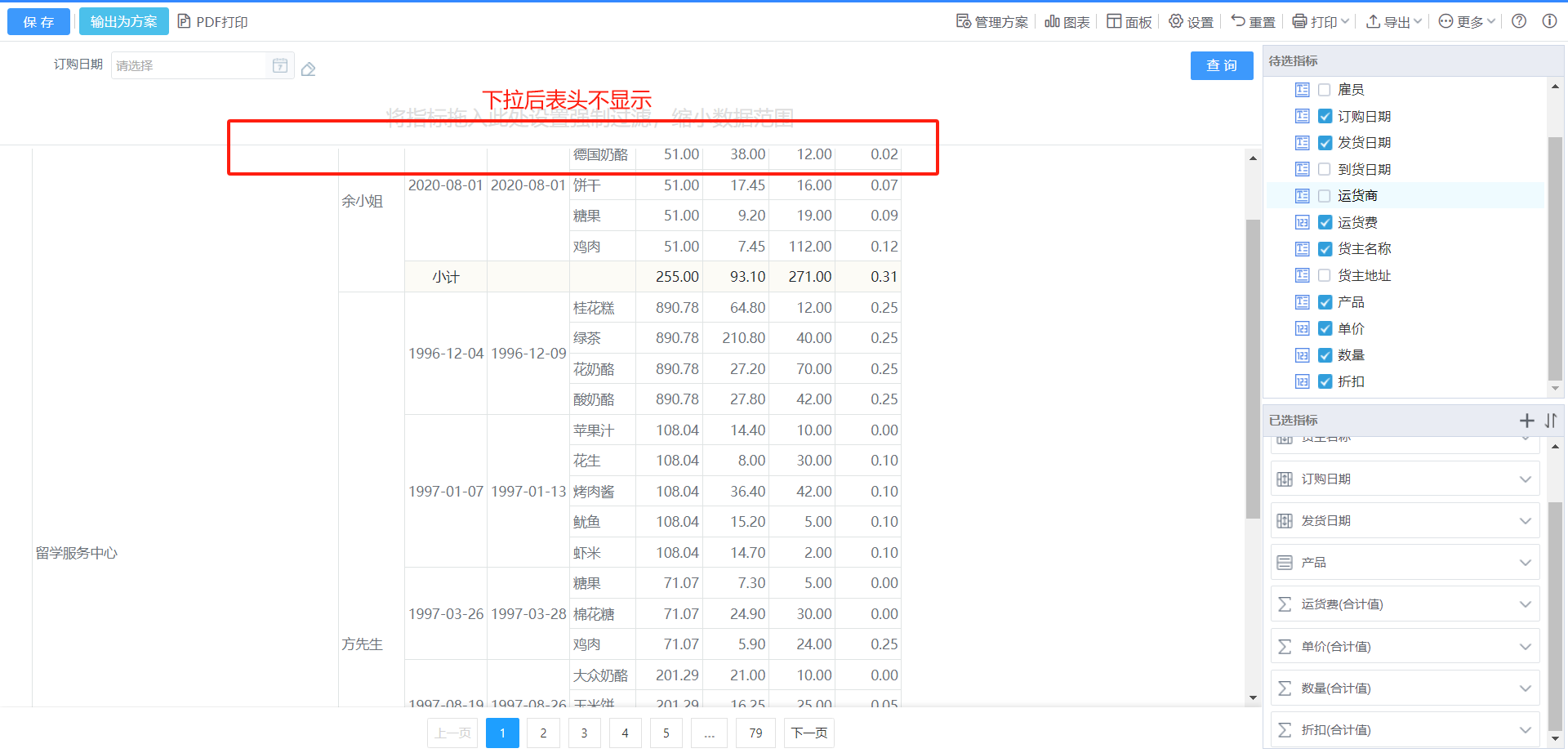 当遇到左右报表超出显示区域,出现个别字段列不显示问题,可以设置冻结指标达到指定列固定。
