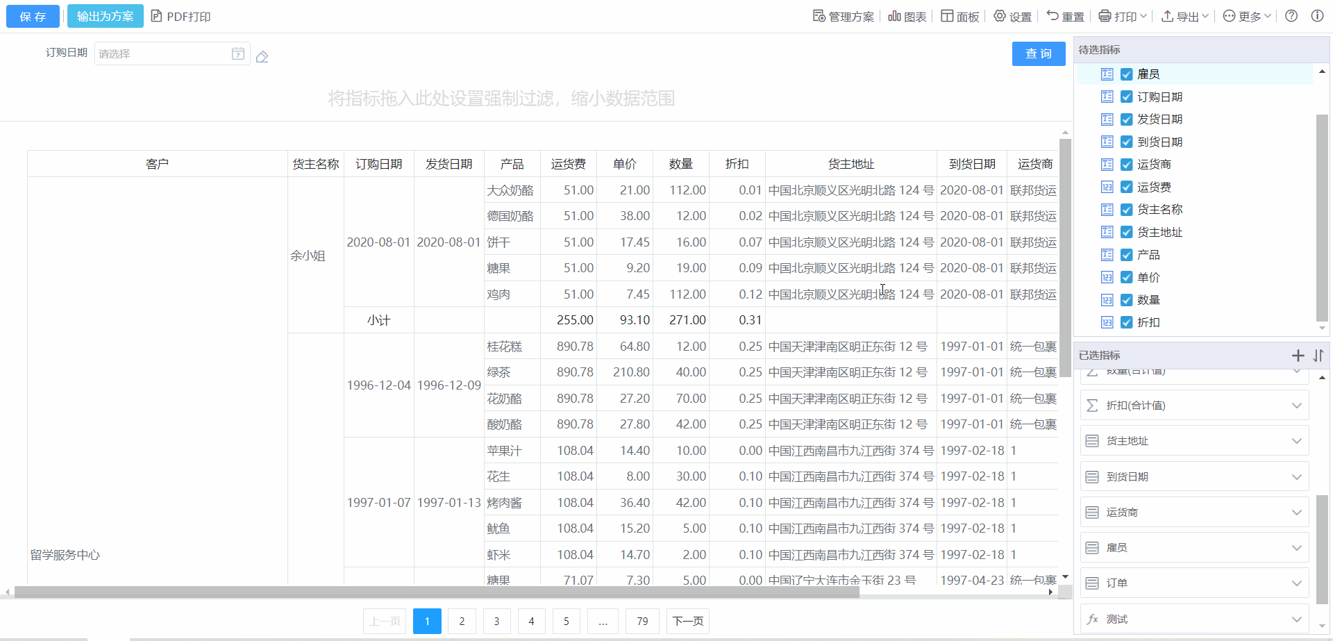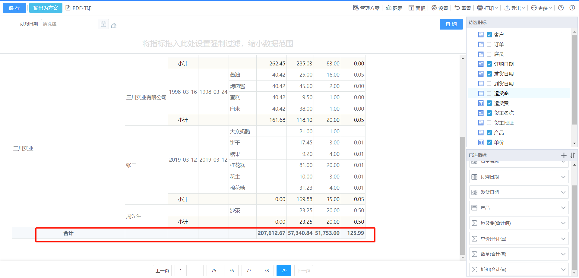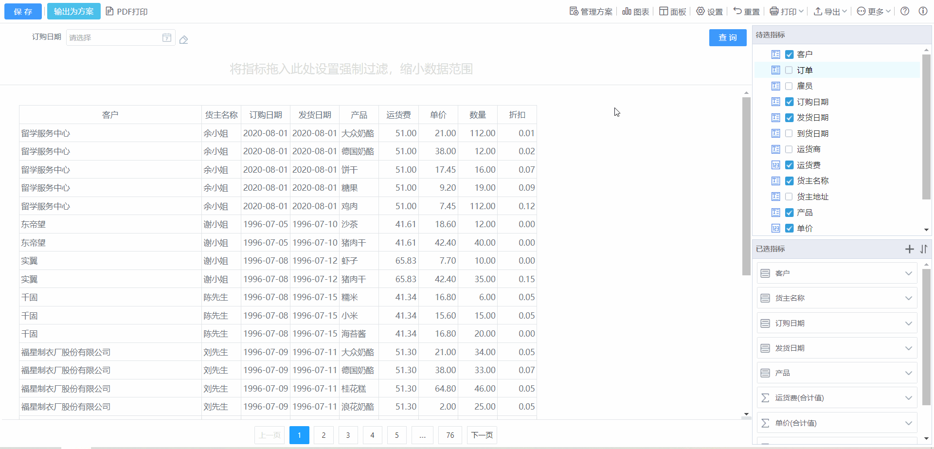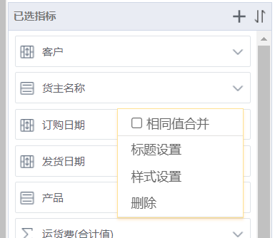 报表中会出现重复数据,进行分组合并显示,可以通过对其客户、货主、日期等指标进行合并处理。