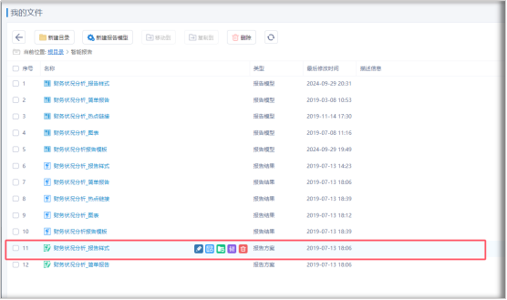 在“个人空间”的“我的文件”中可以看到生成的报告方案,鼠标移动到列表上后出现报告方案的操作功能,如下图:
