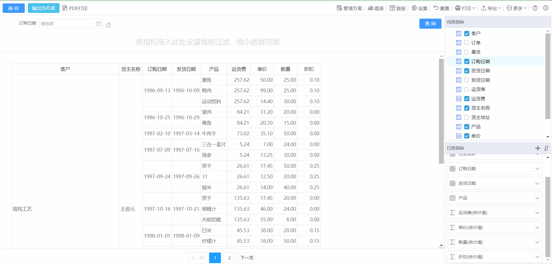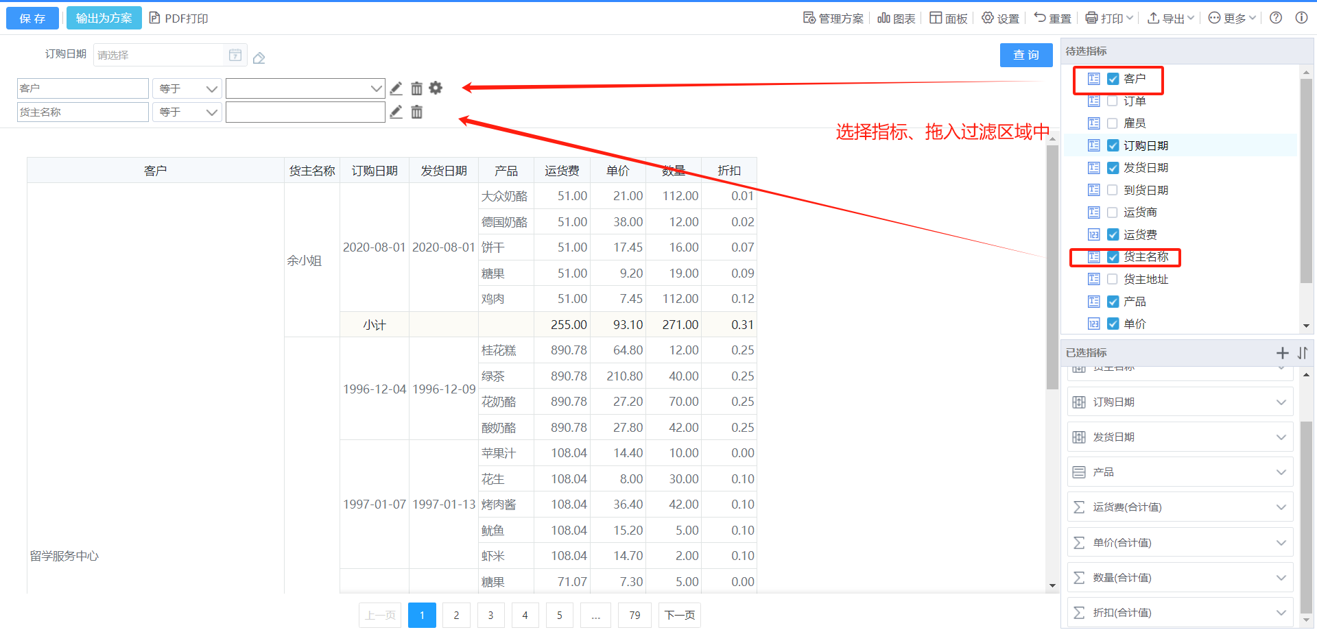 选择客户以及货主名称为过滤对象,并将其拖入过滤区域中,如下图: