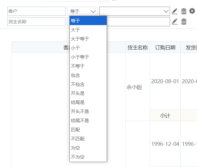在过滤条件中可以设置条件运算符,点击运算符的下拉框可以选择条件运算符,如下图: