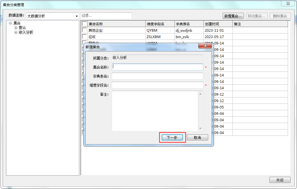 输入对应内容后,点击[下一步]即可进入集合定义界面,具体参考”集合定义”章节说明。