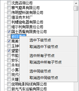 系统在树节点上提供了右键选择菜单,包括 “选中下级节点”、“取消选中下级节点”、“选中所有子节点”、“取消选中所有子节点”四个菜单项,方便用户批量 选择需要操作的成员。如下图: