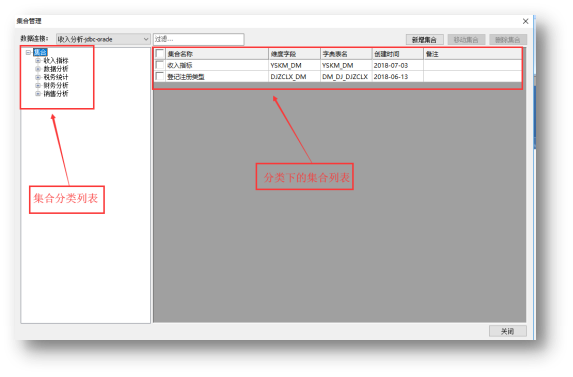 4)在集合分类点击某个分类,右边列表出现当前分类下的所有集合。可以根据维度字段或集合名称模糊匹配查询,在集合列表中查询的集合范围为当前分类中的集合。