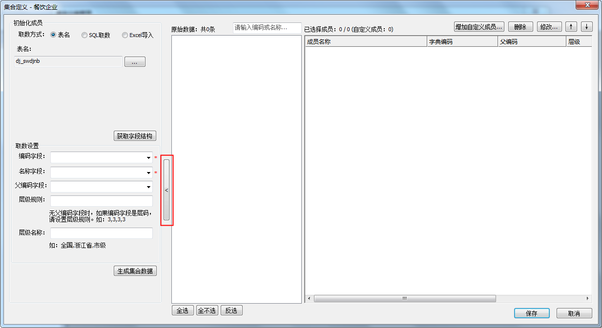 集合成员初始化的取数方式有三种,分别是:表名、SQL取数和Excel导入,默认取数方式为“表名”。