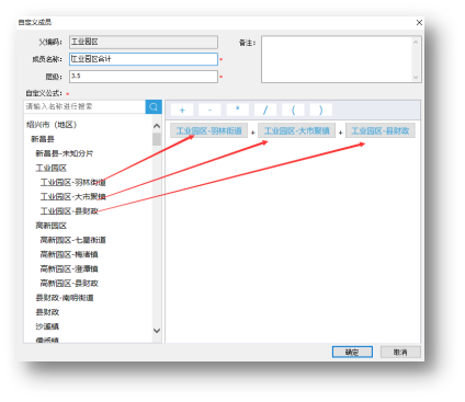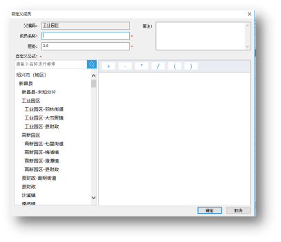 - “自定义公式”分为左右区域,左边区域显示“待选区域”的所有成员,右边区域可以编辑自定义成员的公式。可以将左边的成员拖动到右边的自定义公式编辑区,如下图: