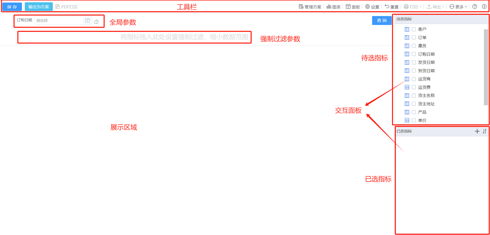 业务人员操作界面由即席查询模型界面、即席查询方案界面、即席查询报表界面组成,其中模型和方案均可自定义样式、指标、过滤等设置,报表则是最后结果不可进行自定义。