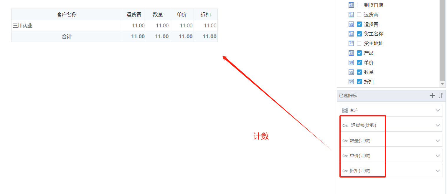 计数是在进行合并相同值的情况下,对数据进行统次数,例如:已知三川实业一共有11个订单,则统计这11条数据中的订单数量、运费、单价、折扣的计数。