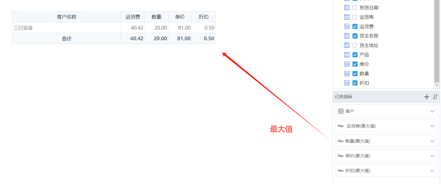 最大值是在进行合并相同值的情况下,对数据进行求最大值,例如:已知三川实业一共有11个订单,则统计这11条数据中的订单数量、运费、单价、折扣最大值。