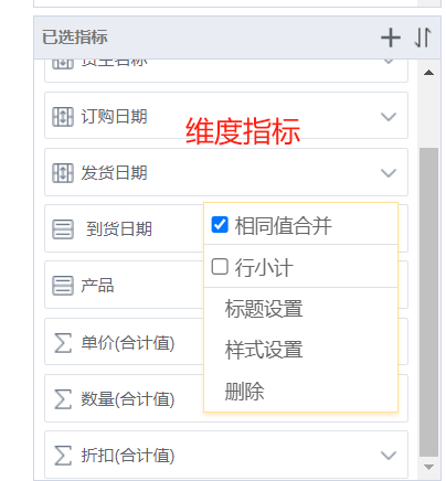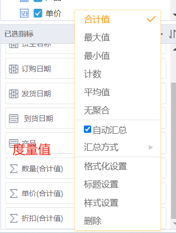 指标包含多种类型:维度指标和度量值,一般情况下字符串日期等字段默认维度指标,统计数值字段默认度量值。根据类型不同,所显示功能也有所区别,如下图:
