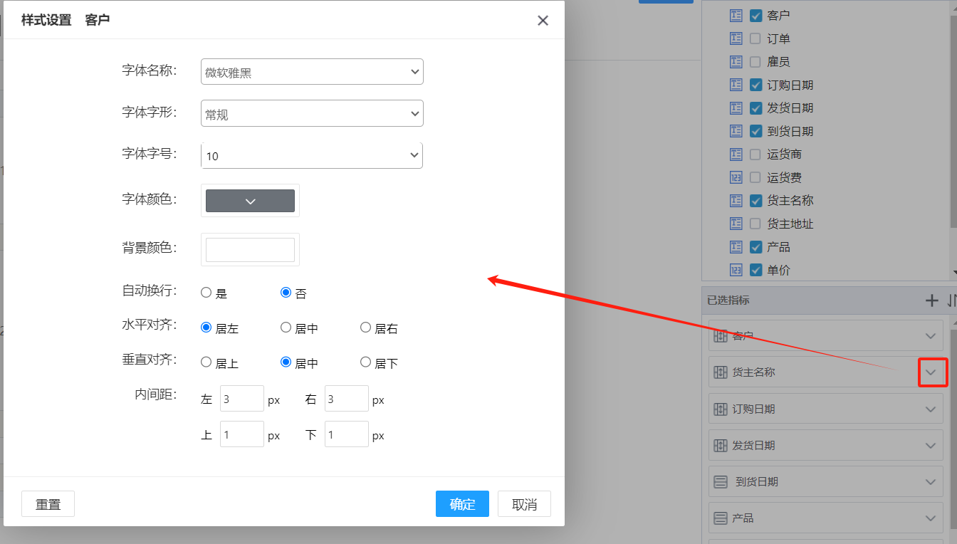 业务人员可根据需求配置指标样式,包含字体、字形、字号、字体颜色、背景颜色、自动换行、对齐方式、内间距等等