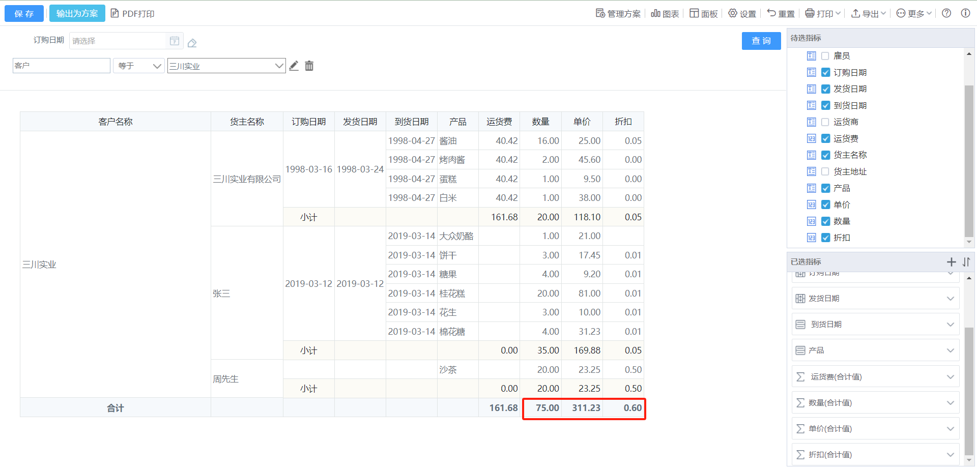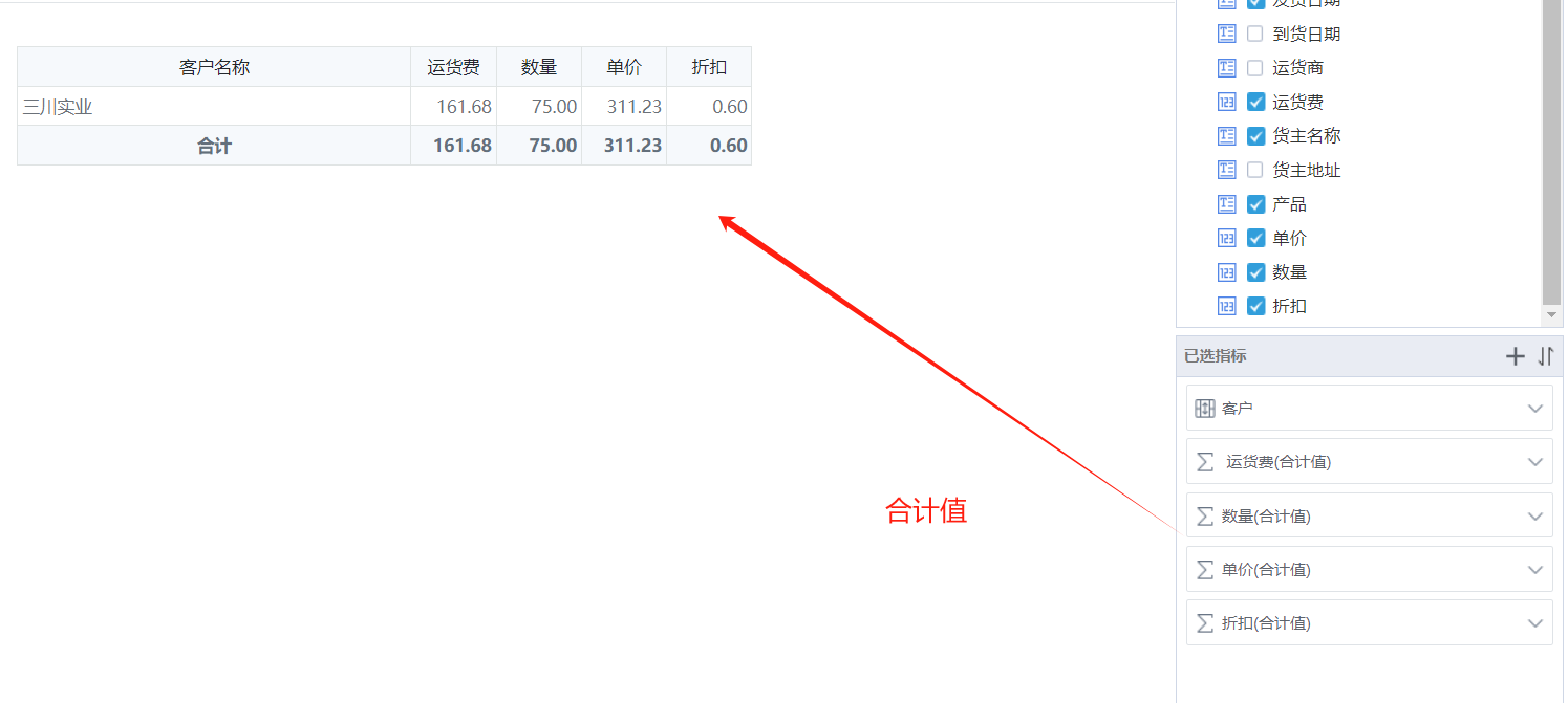 合计值是在进行合并相同值的情况下,对数据进行求和,例如:已知三川实业一共有11个订单,则统计这11条数据中的订单数量、运费、单价、折扣合计值。