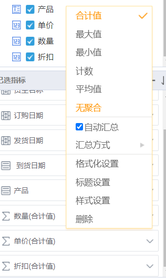 指标配置指的是对单个字段指标进行设计,包含标题设置、样式设置、格式化设置、聚合类型等。